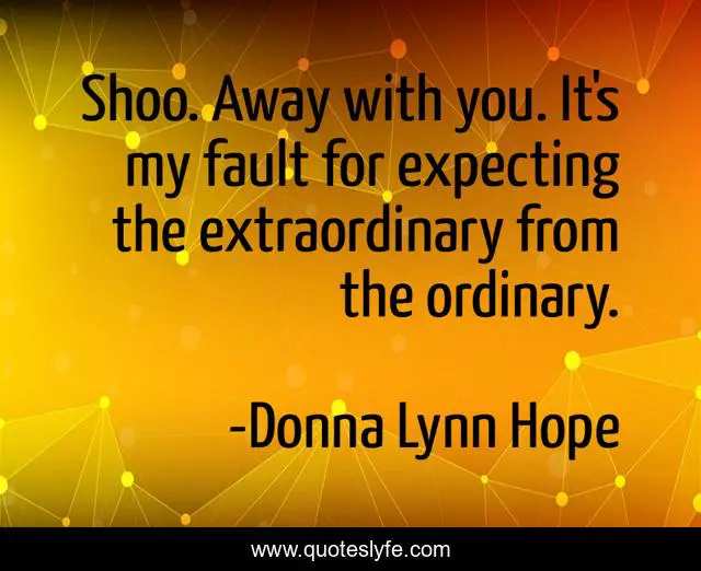 This page presents the quote "Shoo. Away with you. It's my fault for expecting the extraordinary from the ordinary.". Author of this quote is Donna Lynn Hope. This quote is about insulting, breakup, bitterness, insult, breakups, expecting, expectations,.