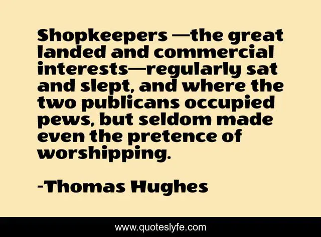 This page presents the quote "Shopkeepers —the great landed and commercial interests—regularly sat and slept, and where the two publicans occupied pews, but seldom made even the pretence of worshipping.". Author of this quote is Thomas Hughes. This quote is about idolatry, materialism,.