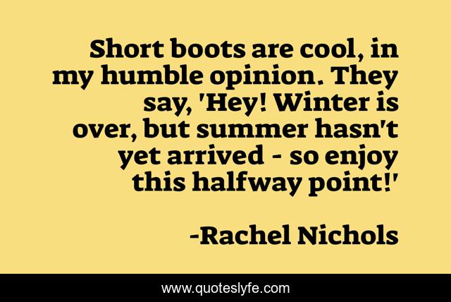This page presents the quote "Short boots are cool, in my humble opinion. They say, 'Hey! Winter is over, but summer hasn't yet arrived - so enjoy this halfway point!'". Author of this quote is Rachel Nichols. This quote is about humble, winter, short,.