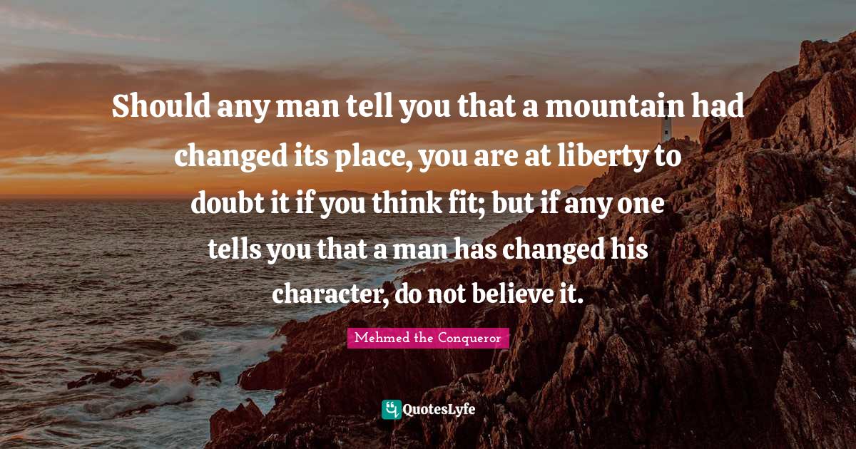 This page presents the quote "Should any man tell you that a mountain had changed its place, you are at liberty to doubt it if you think fit; but if any one tells you that a man has changed his character, do not believe it.". Author of this quote is Mehmed the Conqueror. This quote is about men, character, fit, doubt, liberty, mountain, believe, changed,.