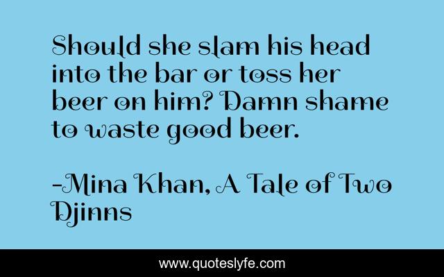 This page presents the quote "Should she slam his head into the bar or toss her beer on him? Damn shame to waste good beer.". Author of this quote is Mina Khan, A Tale of Two Djinns. This quote is about genies, a-tale-of-2-djinns, paranormal-romance,.