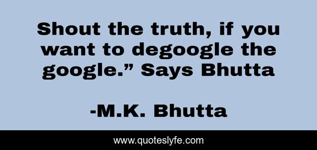 This page presents the quote "Shout the truth, if you want to degoogle the google.” Says Bhutta". Author of this quote is M.K. Bhutta. This quote is about lie, philosophy, truth, modernism,.
