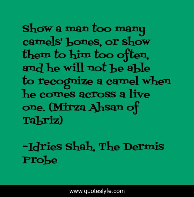 This page presents the quote "Show a man too many camels' bones, or show them to him too often, and he will not be able to recognize a camel when he comes across a live one. (Mirza Ahsan of Tabriz)". Author of this quote is Idries Shah, The Dermis Probe. This quote is about sufism, sufis, mind, psychology, learning,.