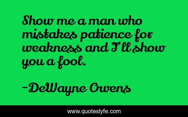 This page presents the quote "Show me a man who mistakes patience for weakness and I’ll show you a fool.". Author of this quote is DeWayne Owens. This quote is about confidence, life-lessons, motivational-inspirational, motivational, wisdom, patience, mistakes, optimistic, inspirational,.