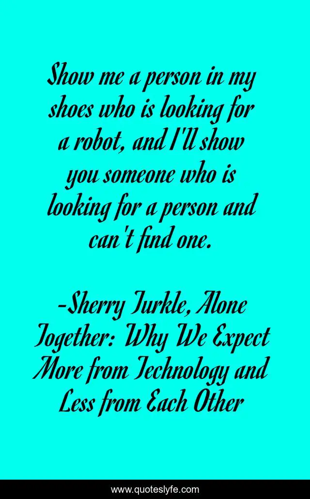 This page presents the quote "Show me a person in my shoes who is looking for a robot, and I'll show you someone who is looking for a person and can't find one.". Author of this quote is Sherry Turkle, Alone Together: Why We Expect More from Technology and Less from Each Other. This quote is about relationships, intimacy, discipleship, technology,.