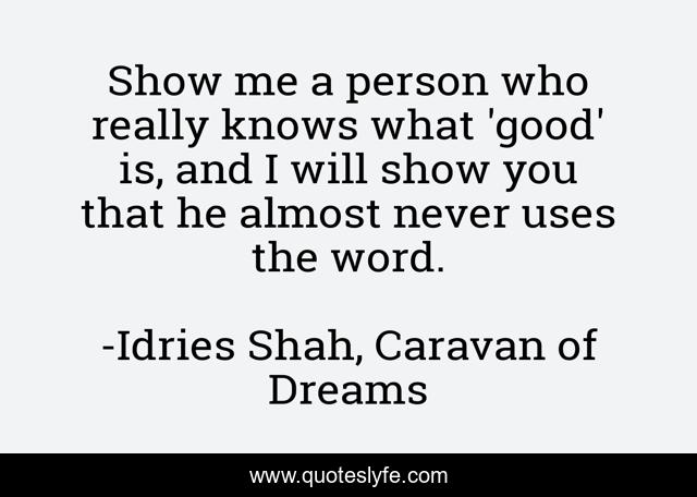 This page presents the quote "Show me a person who really knows what 'good' is, and I will show you that he almost never uses the word.". Author of this quote is Idries Shah, Caravan of Dreams. This quote is about evolution, good, belief, nafs, wisdom, sufism, ego, sufis, knowledge,.