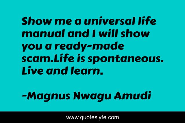 This page presents the quote "Show me a universal life manual and I will show you a ready-made scam.Life is spontaneous. Live and learn.". Author of this quote is Magnus Nwagu Amudi. This quote is about lessons, living, life, scam, life-manual, spontaneity,.