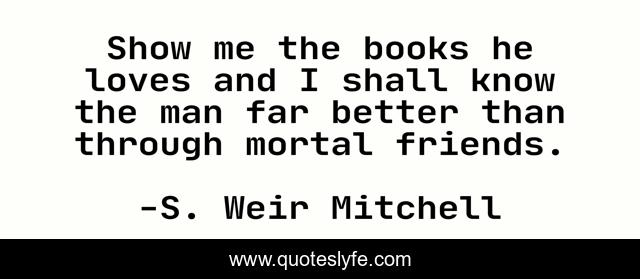 This page presents the quote "Show me the books he loves and I shall know the man far better than through mortal friends.". Author of this quote is S. Weir Mitchell. .