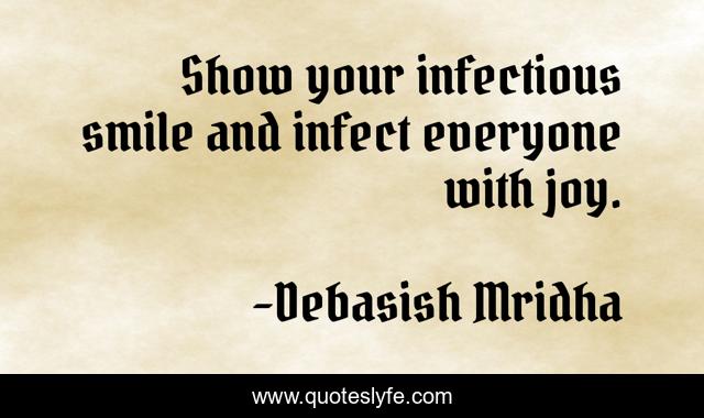 This page presents the quote "Show your infectious smile and infect everyone with joy.". Author of this quote is Debasish Mridha. This quote is about miraboli, power-of-a-smile, infectious-smile, oscar-wilde, joy, philosophy, debasish-mridha, tagore, quotes,.