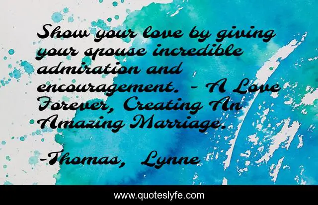 This page presents the quote "Show your love by giving your spouse incredible admiration and encouragement. - A Love Forever, Creating An Amazing Marriage.". Author of this quote is Thomas, Lynne. This quote is about love, marriage, affection, inspiration,.