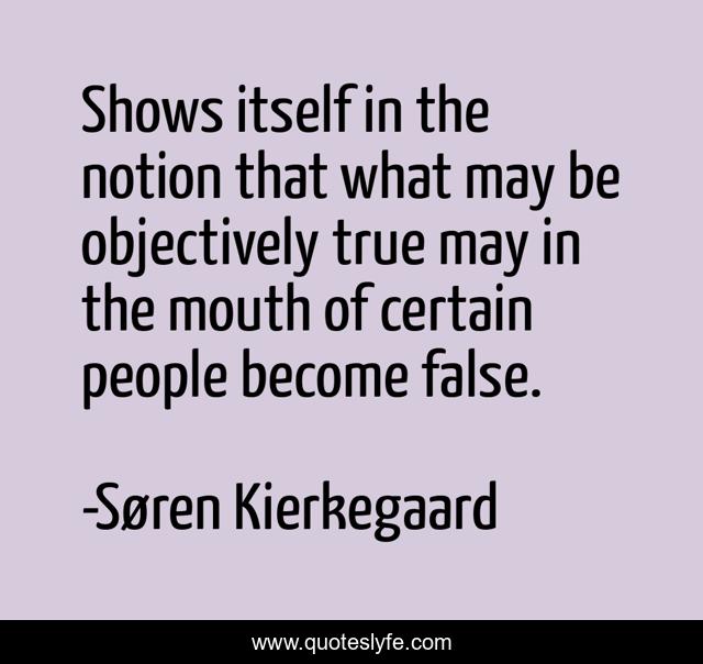 This page presents the quote "Shows itself in the notion that what may be objectively true may in the mouth of certain people become false.". Author of this quote is Søren Kierkegaard. This quote is about faith, reason, subjectivity-is-truth, philosophy-of-religion, subjectivity,.