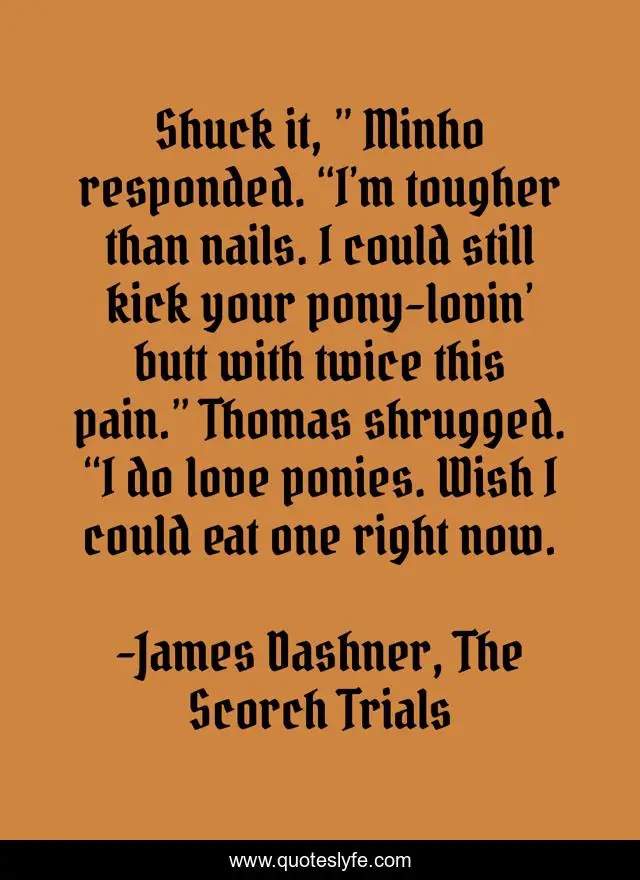 This page presents the quote "Shuck it, ” Minho responded. “I’m tougher than nails. I could still kick your pony-lovin’ butt with twice this pain.” Thomas shrugged. “I do love ponies. Wish I could eat one right now.". Author of this quote is James Dashner, The Scorch Trials. This quote is about pony-lover, humor, minho, scorch-trials,.