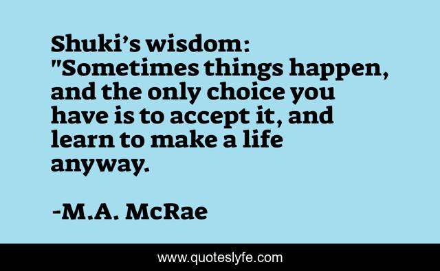 This page presents the quote "Shuki’s wisdom: "Sometimes things happen, and the only choice you have is to accept it, and learn to make a life anyway.". Author of this quote is M.A. McRae. This quote is about acceptance, adjustment,.