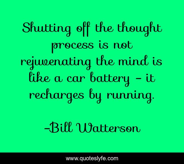 This page presents the quote "Shutting off the thought process is not rejuvenating the mind is like a car battery - it recharges by running.". Author of this quote is Bill Watterson. This quote is about thought, process, mind,.