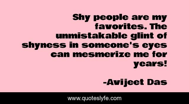This page presents the quote "Shy people are my favorites. The unmistakable glint of shyness in someone's eyes can mesmerize me for years!". Author of this quote is Avijeet Das. This quote is about eyes, writers-life, people, mesmerize, favorite-people, shy-people, glint-of-shyness, shyness, writers,.