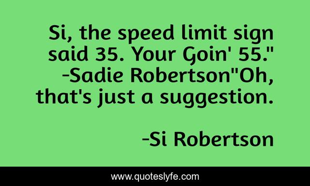 This page presents the quote "Si, the speed limit sign said 35. Your Goin' 55." -Sadie Robertson"Oh, that's just a suggestion.". Author of this quote is Si Robertson. This quote is about duck-dynasty, funny, humor, speed-limit, hilarious, si-robertson, speeding, uncle-si, comedy,.