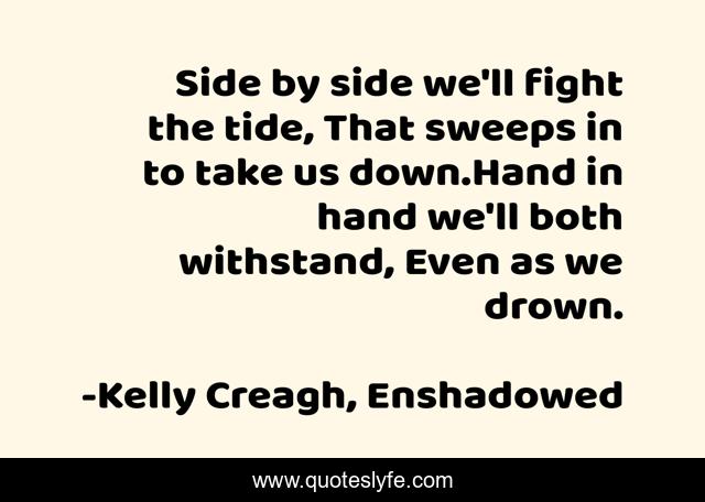 This page presents the quote "Side by side we'll fight the tide, That sweeps in to take us down.Hand in hand we'll both withstand, Even as we drown.". Author of this quote is Kelly Creagh, Enshadowed. This quote is about withstand, fight, sweeps, hand, tide, drown, kelly-creagh, take-us-down, side,.