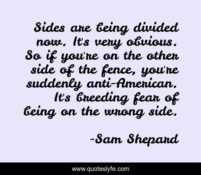 This page presents the quote "Sides are being divided now. It's very obvious. So if you're on the other side of the fence, you're suddenly anti-American. It's breeding fear of being on the wrong side.". Author of this quote is Sam Shepard. This quote is about divided, fence,.