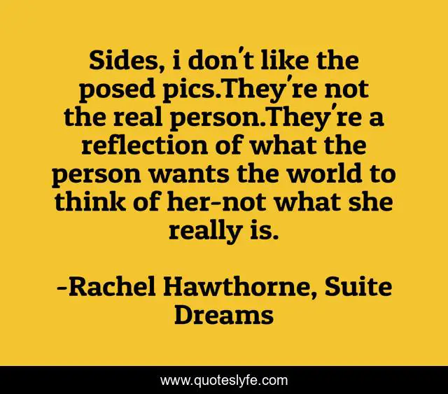 This page presents the quote "Sides, i don't like the posed pics.They're not the real person.They're a reflection of what the person wants the world to think of her-not what she really is.". Author of this quote is Rachel Hawthorne, Suite Dreams. This quote is about photos, true,.