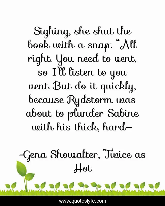 This page presents the quote "Sighing, she shut the book with a snap. “All right. You need to vent, so I’ll listen to you vent. But do it quickly, because Rydstorm was about to plunder Sabine with his thick, hard—". Author of this quote is Gena Showalter, Twice as Hot. .