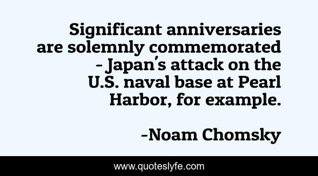 This page presents the quote "Significant anniversaries are solemnly commemorated - Japan's attack on the U.S. naval base at Pearl Harbor, for example.". Author of this quote is Noam Chomsky. This quote is about japan, attack, example,.