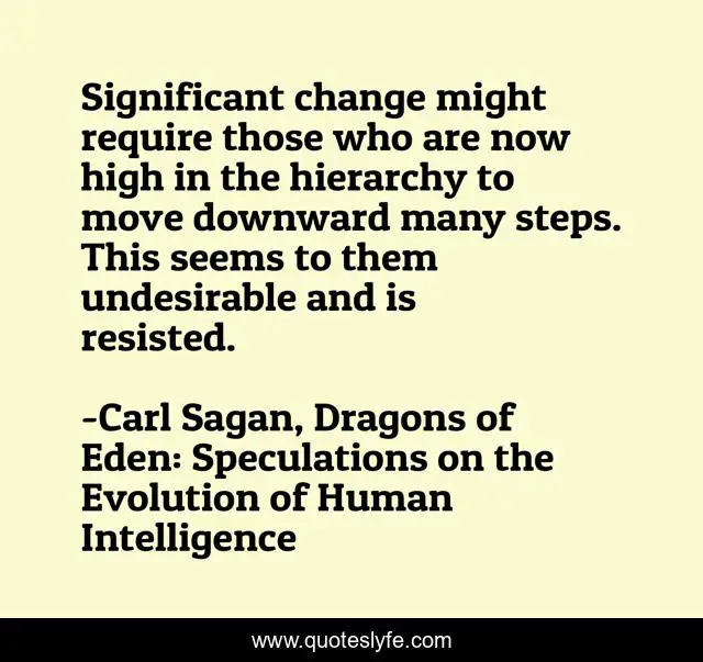 This page presents the quote "Significant change might require those who are now high in the hierarchy to move downward many steps. This seems to them undesirable and is resisted.". Author of this quote is Carl Sagan, Dragons of Eden: Speculations on the Evolution of Human Intelligence. This quote is about intelligence, evolution, science,.