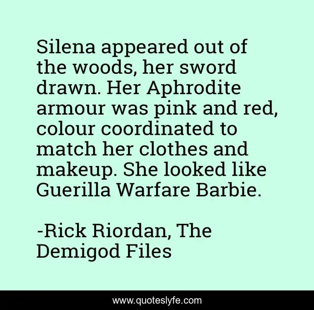 This page presents the quote "Silena appeared out of the woods, her sword drawn. Her Aphrodite armour was pink and red, colour coordinated to match her clothes and makeup. She looked like Guerilla Warfare Barbie.". Author of this quote is Rick Riordan, The Demigod Files. This quote is about pink, funny, comedy, silena-beauregard,.