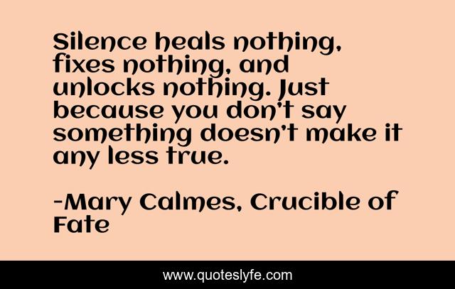 "Mary Calmes, Crucible of Fate Quotes." Quoteslyfe.com, 2025. Sat. 06 Dec. 2025. <https://www.quoteslyfe.com/quote/Silence-heals-nothing-fixes-nothing-and-unlocks-168612>.