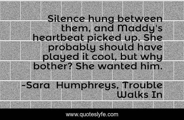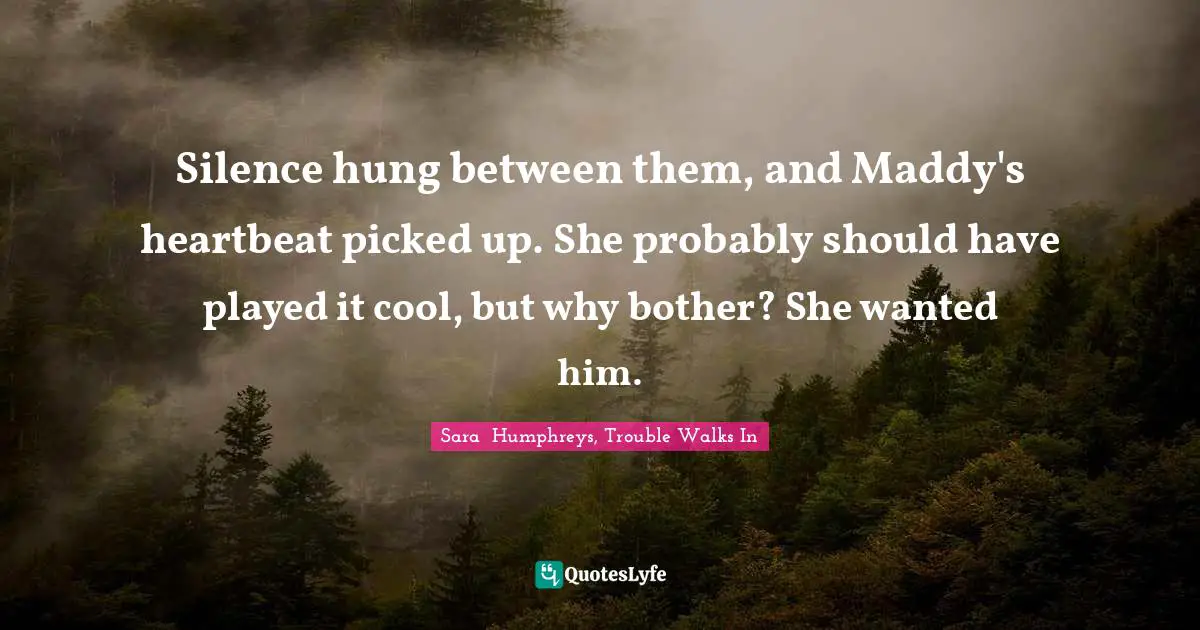 This page presents the quote "Silence hung between them, and Maddy's heartbeat picked up. She probably should have played it cool, but why bother? She wanted him.". Author of this quote is Sara Humphreys, Trouble Walks In. This quote is about contemporary-romance, romantic-suspense,.