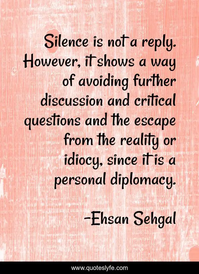 This page presents the quote "Silence is not a reply. However, it shows a way of avoiding further discussion and critical questions and the escape from the reality or idiocy, since it is a personal diplomacy.". Author of this quote is Ehsan Sehgal. .