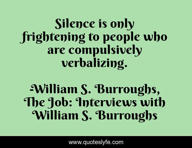 This page presents the quote "Silence is only frightening to people who are compulsively verbalizing.". Author of this quote is William S. Burroughs, The Job: Interviews with William S. Burroughs. This quote is about introspection, reticence, loquacity, remaining-silent, silence,.