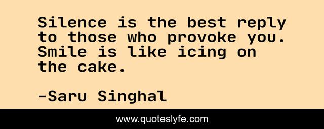 This page presents the quote "Silence is the best reply to those who provoke you. Smile is like icing on the cake.". Author of this quote is Saru Singhal. This quote is about life, silence, quotes-to-live-by, smile, provoke, happiness,.