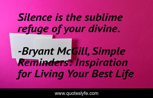 This page presents the quote "Silence is the sublime refuge of your divine.". Author of this quote is Bryant McGill, Simple Reminders: Inspiration for Living Your Best Life. This quote is about divinity, refuge, silence,.
