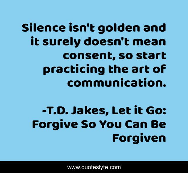 This page presents the quote "Silence isn't golden and it surely doesn't mean consent, so start practicing the art of communication.". Author of this quote is T.D. Jakes, Let it Go: Forgive So You Can Be Forgiven. This quote is about communication, inspirational, quotes-that-make-sense, inspirational-life, enthusiasm, quotes-i-love, silence,.