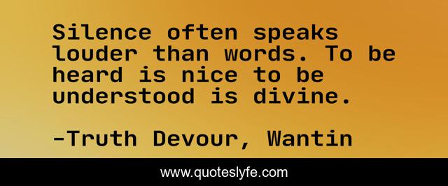 This page presents the quote "Silence often speaks louder than words. To be heard is nice to be understood is divine.". Author of this quote is Truth Devour, Wantin. This quote is about communication, silence, understanding,.