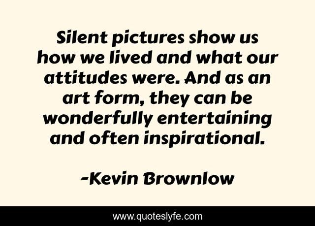 This page presents the quote "Silent pictures show us how we lived and what our attitudes were. And as an art form, they can be wonderfully entertaining and often inspirational.". Author of this quote is Kevin Brownlow. This quote is about pictures, art, silent,.