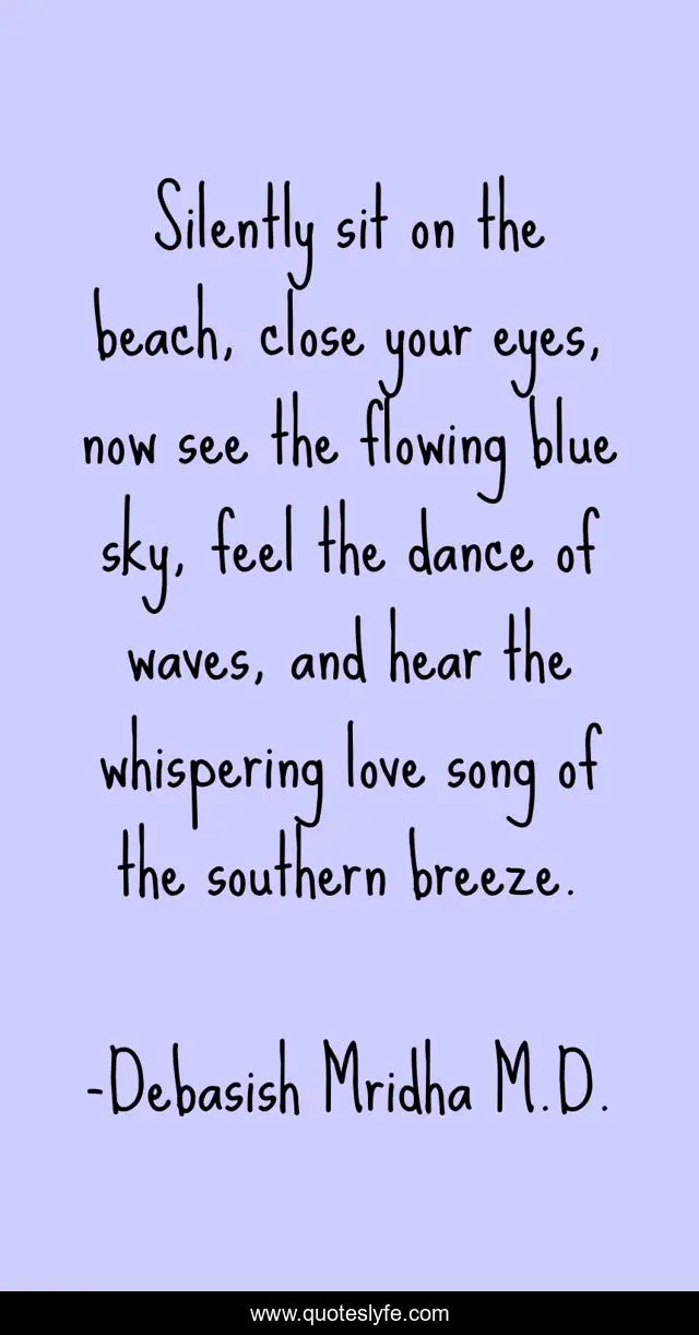 This page presents the quote "Silently sit on the beach, close your eyes, now see the flowing blue sky, feel the dance of waves, and hear the whispering love song of the southern breeze.". Author of this quote is Debasish Mridha M.D.. This quote is about hear-the-whispering-love-song, dance-of-waves, love-song, philosophy, debasish-mridha, quotes, inspirational, enthusiasm, beach,.