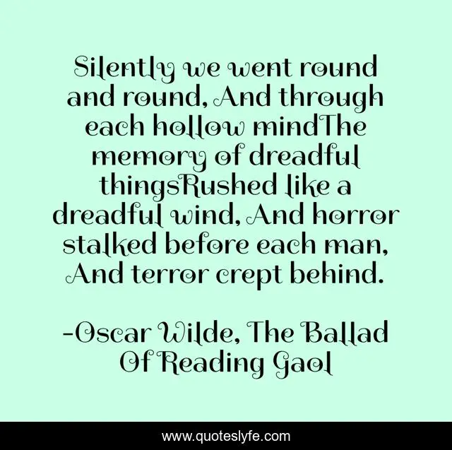 This page presents the quote "Silently we went round and round, And through each hollow mindThe memory of dreadful thingsRushed like a dreadful wind, And horror stalked before each man, And terror crept behind.". Author of this quote is Oscar Wilde, The Ballad Of Reading Gaol. This quote is about terror, horror, memory,.