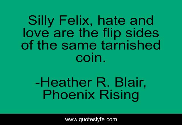 This page presents the quote "Silly Felix, hate and love are the flip sides of the same tarnished coin.". Author of this quote is Heather R. Blair, Phoenix Rising. This quote is about hate, love, choose, affection,.