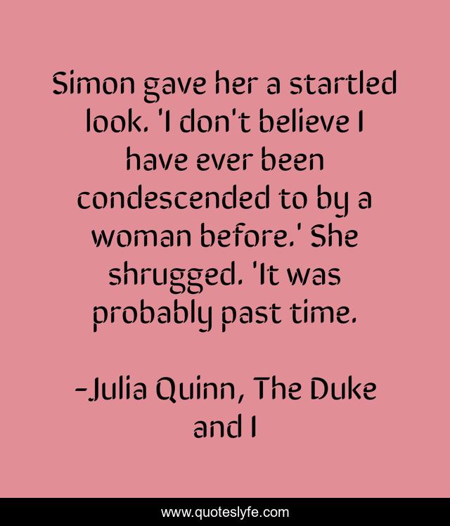 This page presents the quote "Simon gave her a startled look. 'I don't believe I have ever been condescended to by a woman before.' She shrugged. 'It was probably past time.". Author of this quote is Julia Quinn, The Duke and I. This quote is about romance, funny, romance-book, comedy, feminism,.