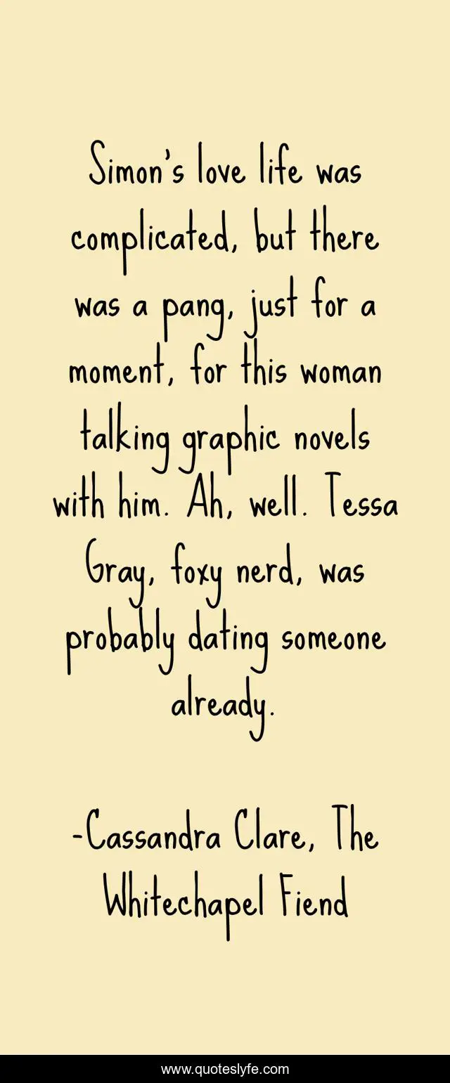 This page presents the quote "Simon’s love life was complicated, but there was a pang, just for a moment, for this woman talking graphic novels with him. Ah, well. Tessa Gray, foxy nerd, was probably dating someone already.". Author of this quote is Cassandra Clare, The Whitechapel Fiend. This quote is about foxy-nerd, tessa-gray, heart, pang, simon-lewis, dating, graphic-novels,.