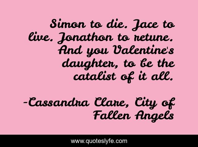 This page presents the quote "Simon to die. Jace to live. Jonathon to retune. And you Valentine's daughter, to be the catalist of it all.". Author of this quote is Cassandra Clare, City of Fallen Angels. This quote is about mystery, fantasy, romance, thriller,.