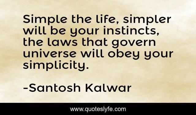This page presents the quote "Simple the life, simpler will be your instincts, the laws that govern universe will obey your simplicity.". Author of this quote is Santosh Kalwar. This quote is about inspirational, love, truth, affection, enthusiasm,.
