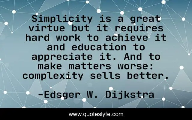 This page presents the quote "Simplicity is a great virtue but it requires hard work to achieve it and education to appreciate it. And to make matters worse: complexity sells better.". Author of this quote is Edsger W. Dijkstra. This quote is about simple, simplicity, complexity, virtue, elegance,.