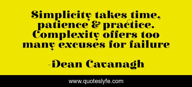 This page presents the quote "Simplicity takes time, patience & practice. Complexity offers too many excuses for failure". Author of this quote is Dean Cavanagh. This quote is about failure, simplicity,.