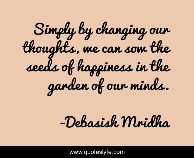 This page presents the quote "Simply by changing our thoughts, we can sow the seeds of happiness in the garden of our minds.". Author of this quote is Debasish Mridha. This quote is about how-to-be-positive, philosophy, debasish-mridha, quotes, debasish-mridha-md, inspirational, enthusiasm, changing-our-thoughts, happiness,.
