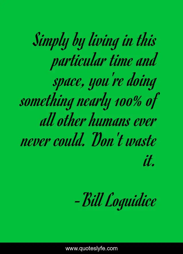 This page presents the quote "Simply by living in this particular time and space, you're doing something nearly 100% of all other humans ever never could. Don't waste it.". Author of this quote is Bill Loguidice. This quote is about enthusiasm, thought-provoking, inspirational,.