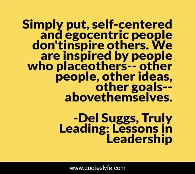 This page presents the quote "Simply put, self-centered and egocentric people don'tinspire others. We are inspired by people who placeothers-- other people, other ideas, other goals-- abovethemselves.". Author of this quote is Del Suggs, Truly Leading: Lessons in Leadership. This quote is about confidence, positive, motivational, optimistic, inspirational, enthusiasm,.