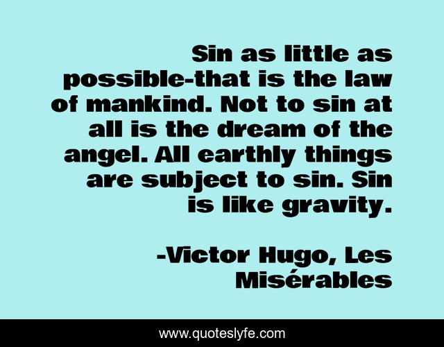 This page presents the quote "Sin as little as possible-that is the law of mankind. Not to sin at all is the dream of the angel. All earthly things are subject to sin. Sin is like gravity.". Author of this quote is Victor Hugo, Les Misérables. This quote is about angels, sin,.