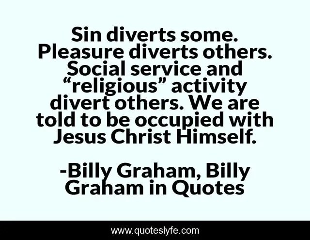 This page presents the quote "Sin diverts some. Pleasure diverts others. Social service and “religious” activity divert others. We are told to be occupied with Jesus Christ Himself.". Author of this quote is Billy Graham, Billy Graham in Quotes. This quote is about billy-graham, jesus,.